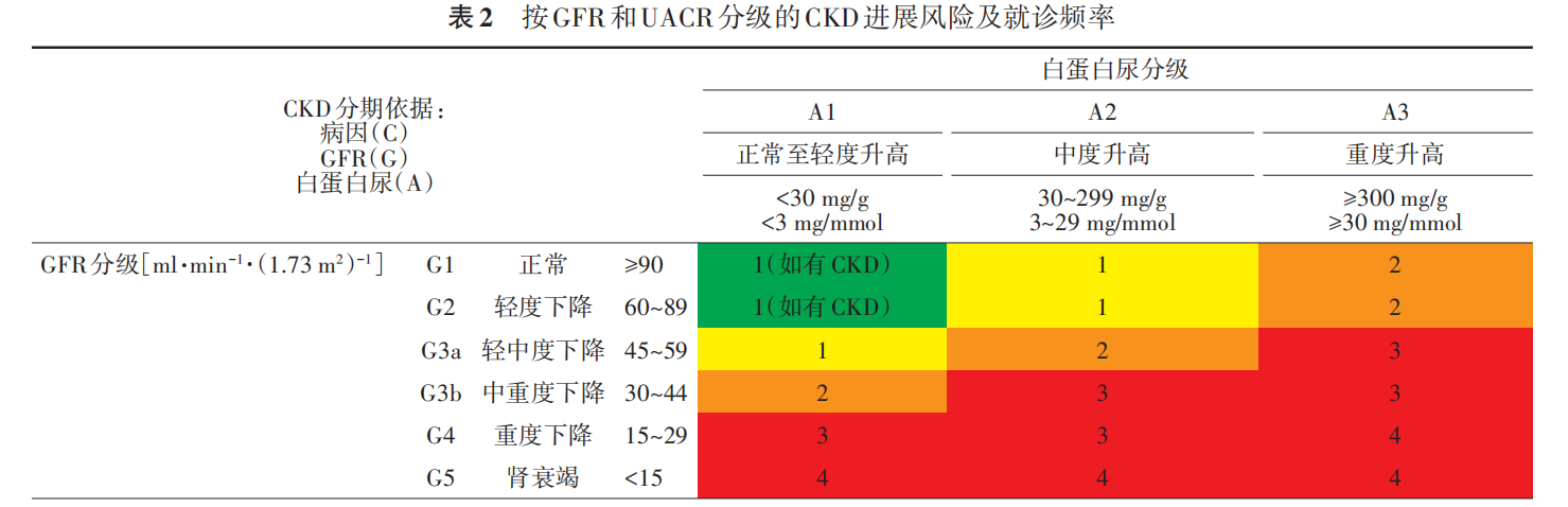 注:GFR為腎小球濾過率;UACR為尿白蛋白/肌酐比值;CKD為慢性腎臟?。槐砀裰械臄?shù)字為建議每年復查的次數(shù);背景顏色代表CKD進展的風險:綠色為低風險,黃色為中風險,橙色為高風險,紅色為極高風險