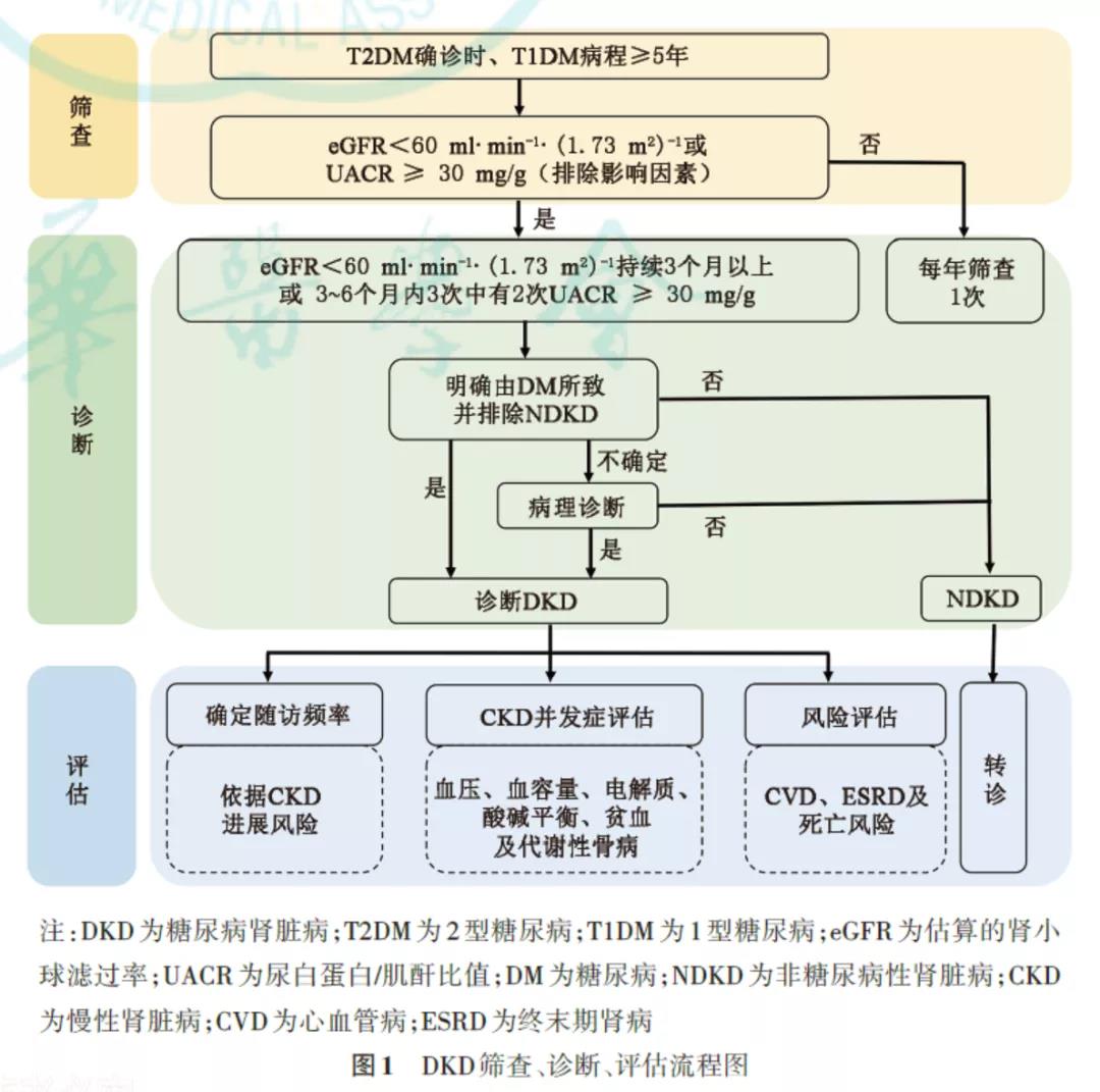 在確診DKD后,應根據(jù)GFR及尿白蛋白水平進一步判斷CKD分期,同時評估DKD進展風險及明確復查頻率。