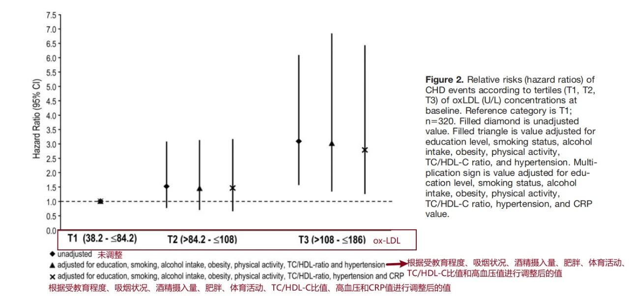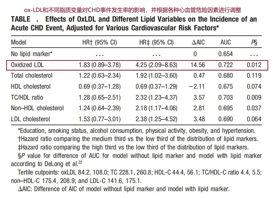 ②血漿中的循環(huán)ox-LDL是識(shí)別冠心病風(fēng)險(xiǎn)的一個(gè)有用的標(biāo)志物。在同一模型中同時(shí)評(píng)估ox-LDL時(shí),即使在調(diào)整了所有傳統(tǒng)心血管風(fēng)險(xiǎn)因素和TC/HDL-C比值(傳統(tǒng)血脂變量中最有力的風(fēng)險(xiǎn)預(yù)測(cè)因素之一)后,ox-LDL仍能預(yù)測(cè)未來(lái)的冠心病事件。