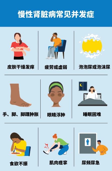 早期慢性腎臟病通常沒有癥狀,但隨著時間的推移而惡化,常見癥狀包括尿量減少、由于組織液增多引起體重增加(水腫)、疲勞乏力、食欲不振或體重無故減輕等。