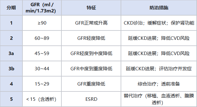 慢性腎臟病的分期目前普遍采用的是美國腎臟基金會制定的指南,按照腎臟病改善全球預后(KDIGO)指南的分期標準,將慢性腎臟病根據(jù)eGFR分為1-5期。