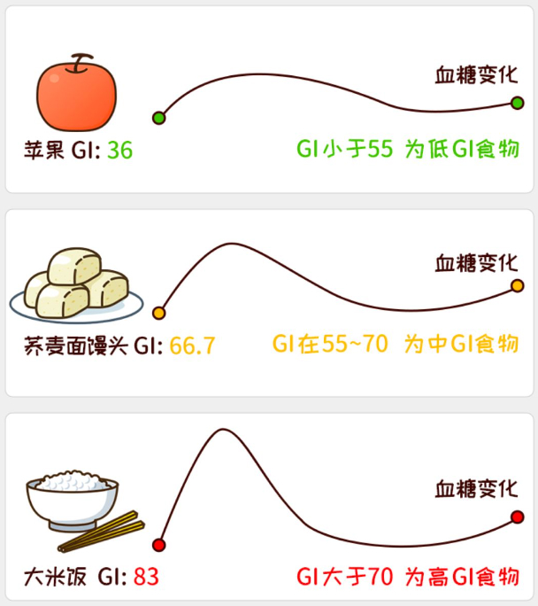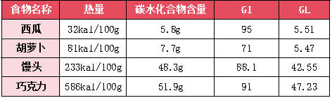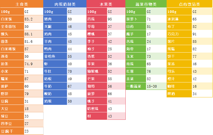 高GL食物:GL≥20。提示食用的相當(dāng)重量的食物對(duì)血糖的影響明顯。