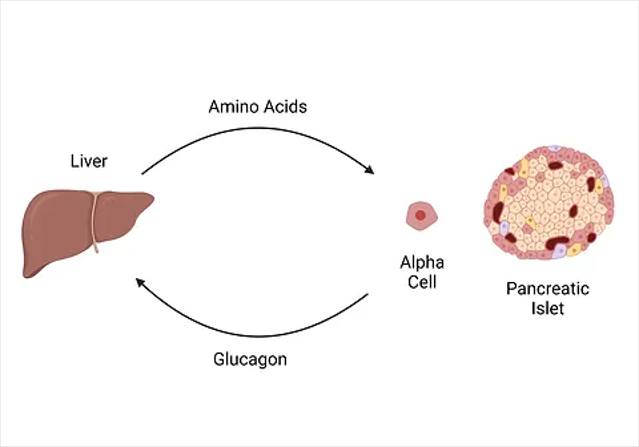 在代謝性疾病中,如2型糖尿病和/或代謝相關(guān)脂肪性肝病,肝臟脂肪變性會在肝臟脂質(zhì)和氨基酸代謝水平上升時導致對胰高血糖素的抵抗,胰高血糖素刺激的尿素生成減少,循環(huán)中的氨基酸水平會升高,這種高氨基酸血癥會導致高胰高血糖素血癥。