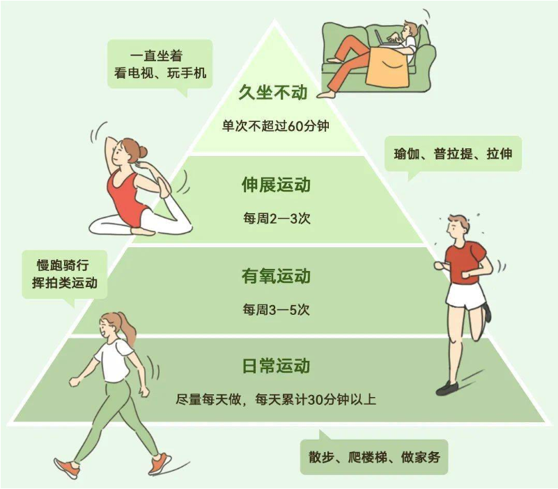 若平時(shí)很忙或者剛開始進(jìn)行運(yùn)動(dòng),就可以先從第一層的日常運(yùn)動(dòng)開始,利用瑣碎時(shí)間散散步,做做家務(wù)。相關(guān)研究顯示,與從不運(yùn)動(dòng)的人相比,每天走路30分鐘以上的,可以降低46%的潛在患病風(fēng)險(xiǎn)。